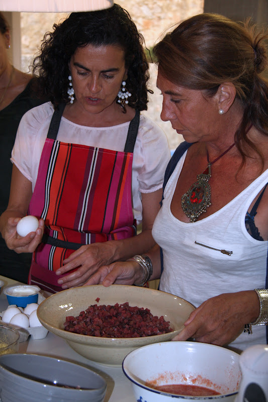 Las veo empezar a hacer un centro de flores( que fácil eso lo hago yo y me queda ideal) y cogen cuatro flores , tres palitos , un poco de hierba larga, algo de mala hierba de esa que en tu jardín pisas y que me entero que tiene nombre, que es preciosa y que adorna muchísimo , eso que pincha y tiene bolitas rojas, un poco de eucaliptus tan mono que si lo buscas por el "prao" no existe y de repente el centro está acabado y a ti se te ha quedado cara de tonta.